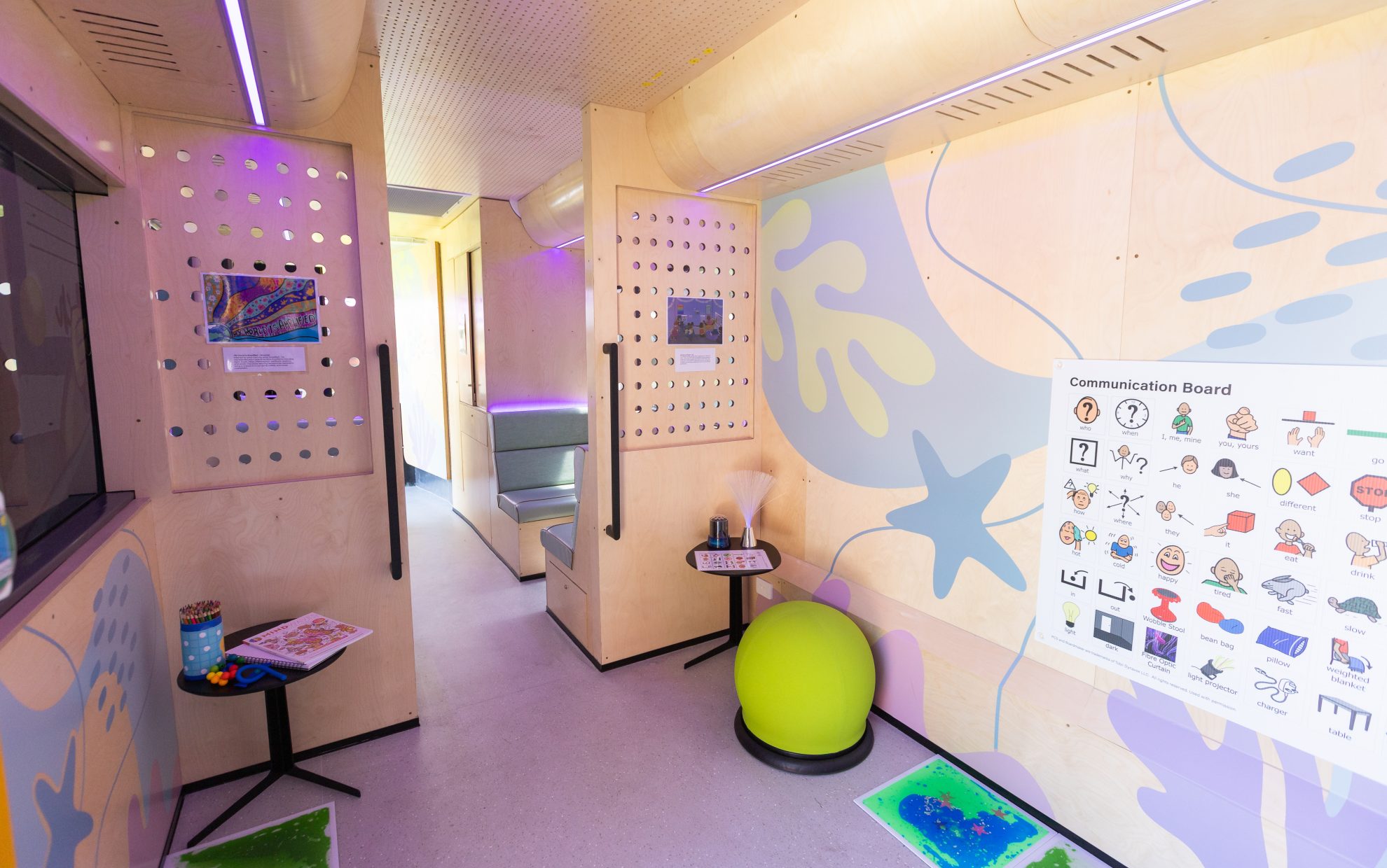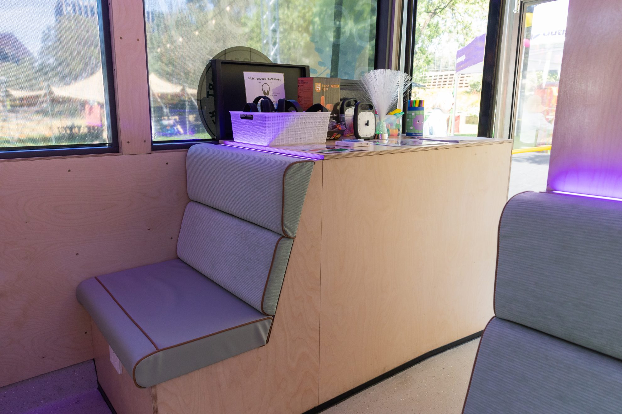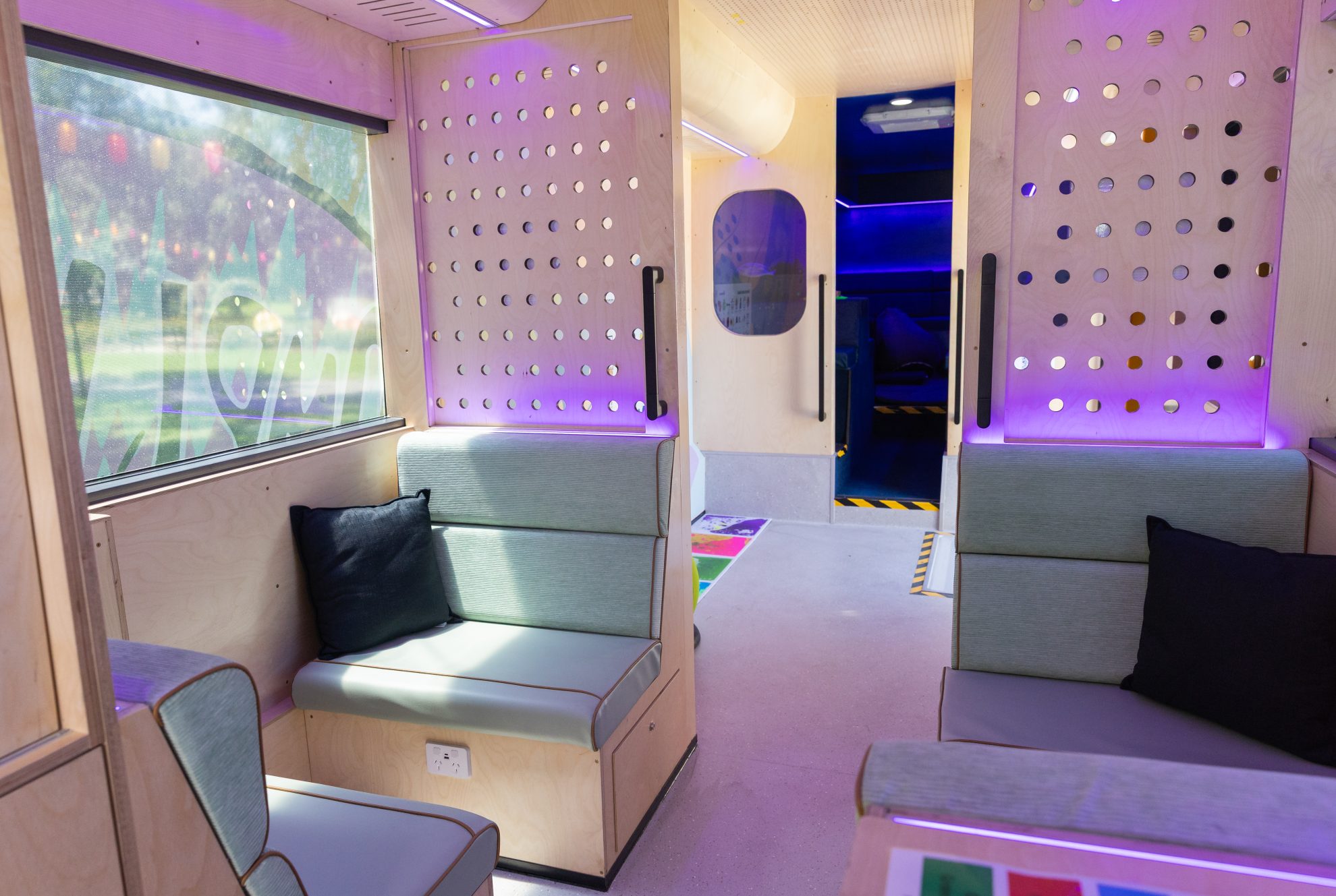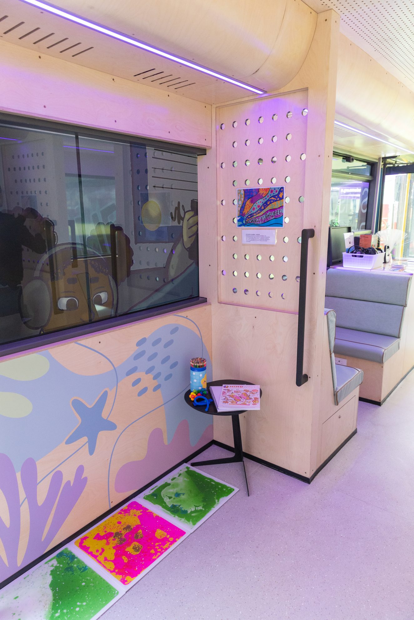 At the heart of the bus lies an open activity zone designed to support proprioceptive engagement and emotional regulation through play. Colourful, textural graphics line the walls while liquid sensory flooring tiles animate the floor. The floor plan ensures wheelchair accessibility and flexibility for future tactile and sensory additions.