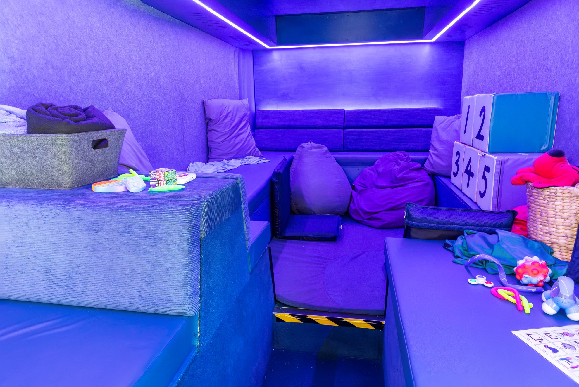 At the rear, the sensory regulation pod serves as a tranquil retreat, thoughtfully designed to support light and noise sensitivities. Drawing inspiration from an ‘under the sea’ concept, a calming palette of blues and purples creates an immersive yet soothing environment for those who need time and space to regulate.