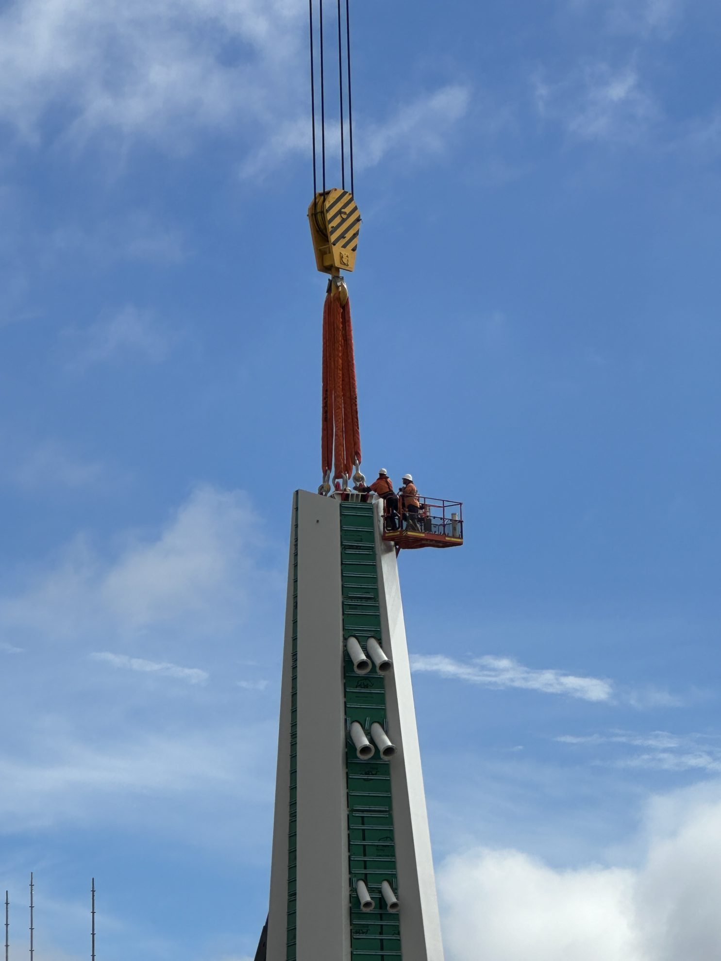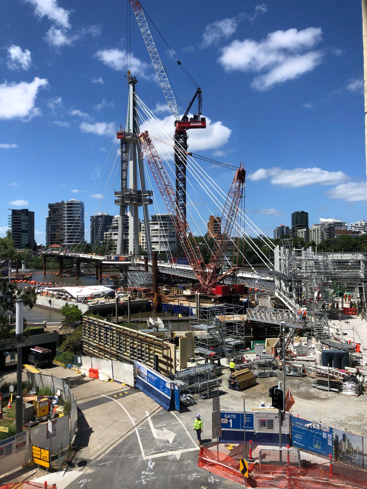 Construction began in late 2021 and was once again paused for almost 6 months due to the flooding of 2022. More than 1,800 people worked on the bridge, totalling 760,000 hours of construction work as crews assembled eight deck spans and a 95-metre mast – the tallest bridge in Queensland. The mast was lifted into place using the world’s strongest tower crane, highlighting the scale of the project. The deck sits 12.7 metres above the Brisbane River, supported by 32 cables stretching 3.5 kilometres, with ten barges working on the river during peak construction.