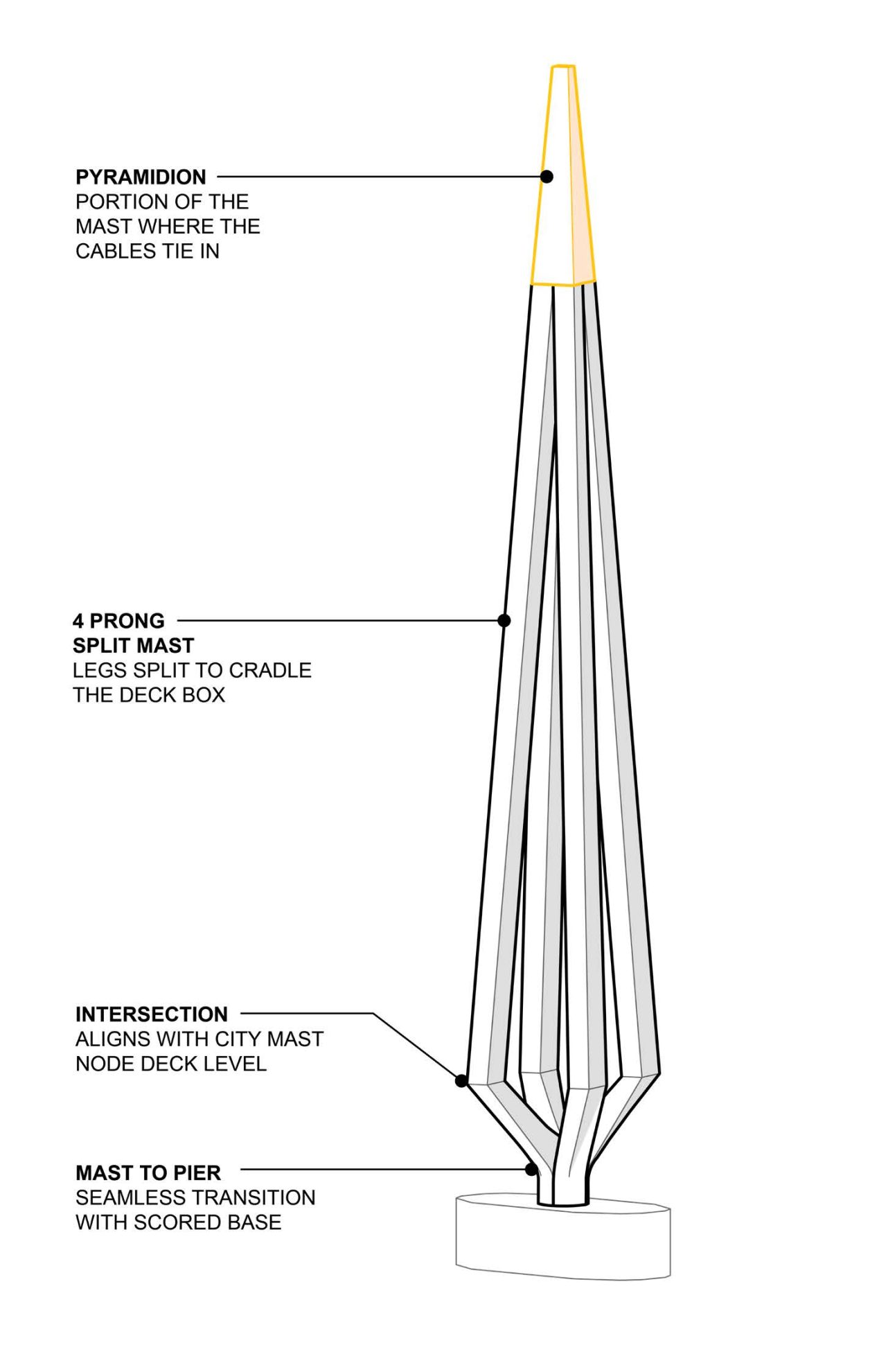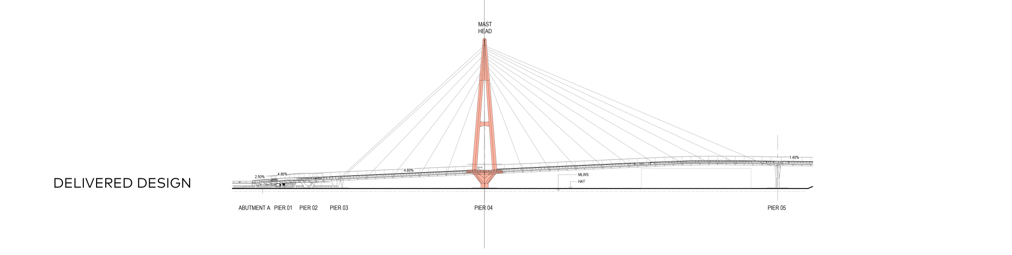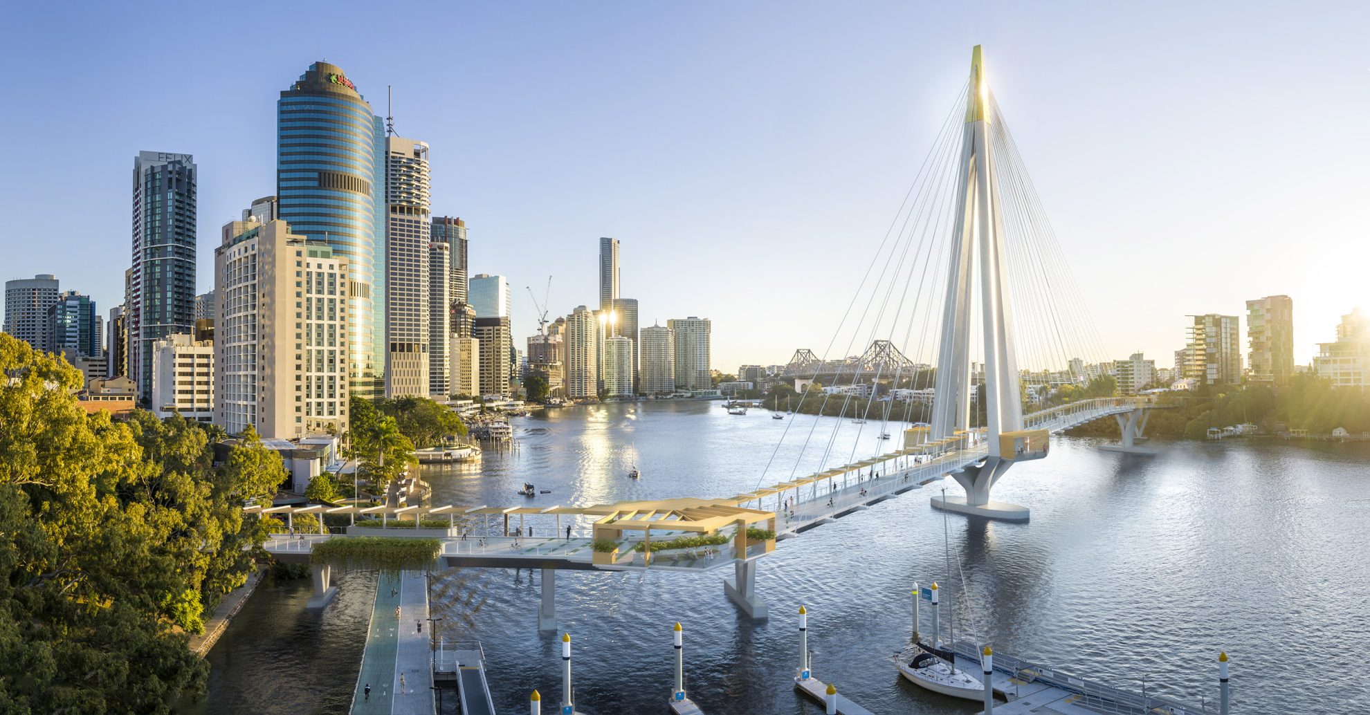 The reference design established the bridge’s location, landings, alignment, and defining form: a single, elegant, four-legged mast supporting a slender deck that spans across the river. The design team envisioned the bridge as a series of “threaded jewels” suspended above the water, offering moments to pause, rest, and take in the city from new perspectives. The four-legged mast provides a cradle to view the Story Bridge, the CBD, the Botanic Gardens and Kangaroo Point Cliffs. The design transformed a long-discussed connection into a city-making project, enhancing Brisbane’s active transport network, strengthening the public realm, and celebrating the city’s subtropical lifestyle.