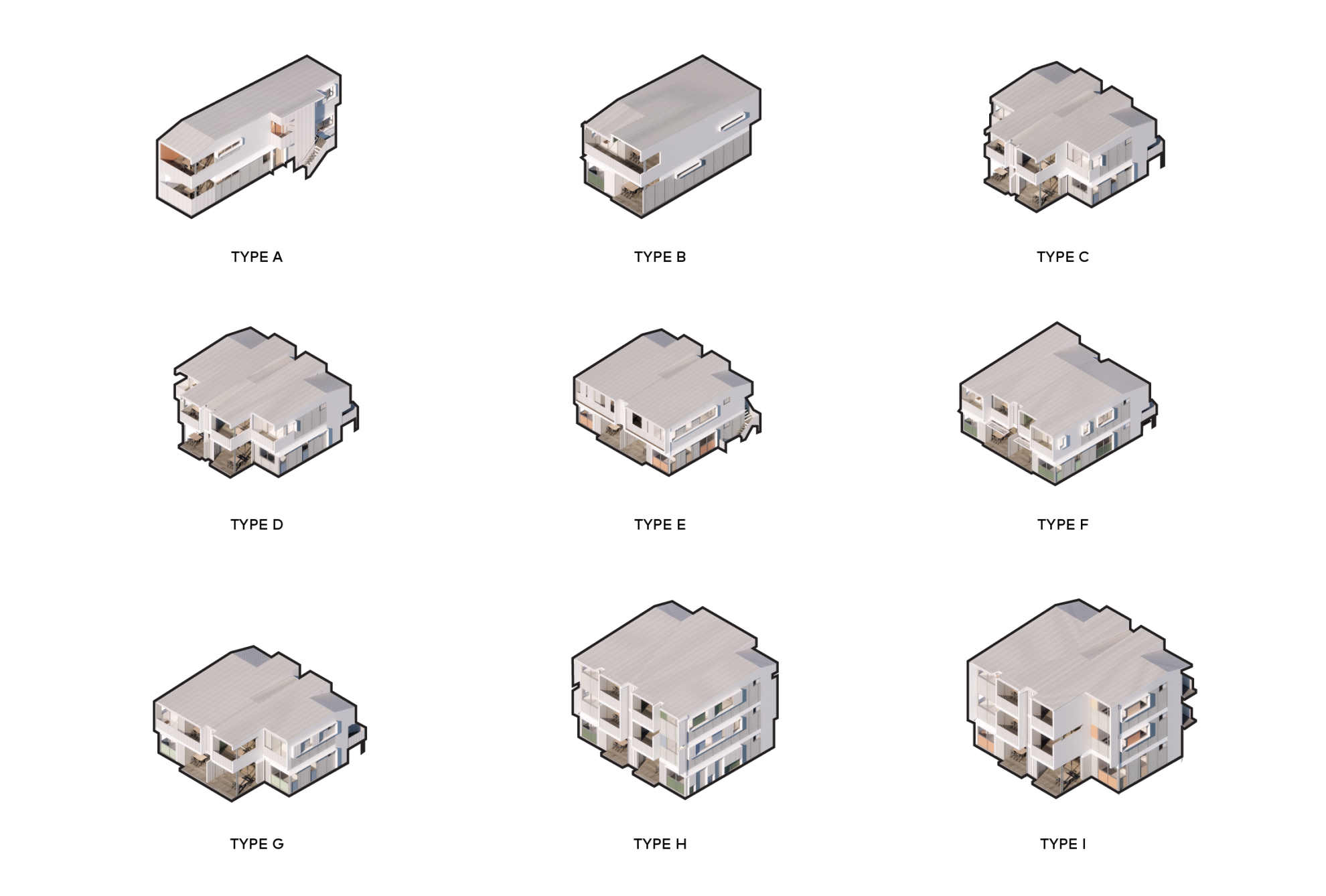 Across these sites, COX and Hutchinson Builders have designed nine typologies of low-rise modular housing. These typologies form a cohesive ‘family’ of architectural forms that can be configured in a variety of ways and multiple site arrangements, ensuring their adaptability to suit specific locations and future projects beyond these packages.