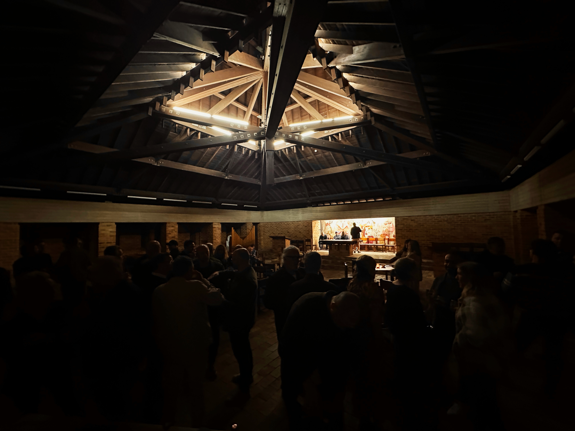 As Philip guided our Directorship around the grounds, he reminded them that Tocal is about more than form – at its heart, the project is defined by its making. Local timbers – ironbark, tallowwood, brush box – were sawn, hewn, and meticulously jointed in place. He also highlighted how the team had a hand in designing and crafting the furniture, with the chapel tapestry, lighting, and signage all carefully curated to realise a single, cohesive vision.