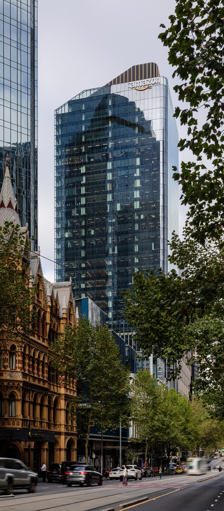 The form and façade expression of the podium and tower also contextually respond at both the city and sky-line scales – the solidity of the base extends through the podium, referencing the textural qualities of the historic Federal Coffee Palace facades, a series of articulated fins that change in size, depth and tone, providing movement through light and shadow, and the sculptural folded aluminium crown at the top of the crystalline tower form acting as an urban marker in the skyline, as seen from across the Yarra River and Southbank.