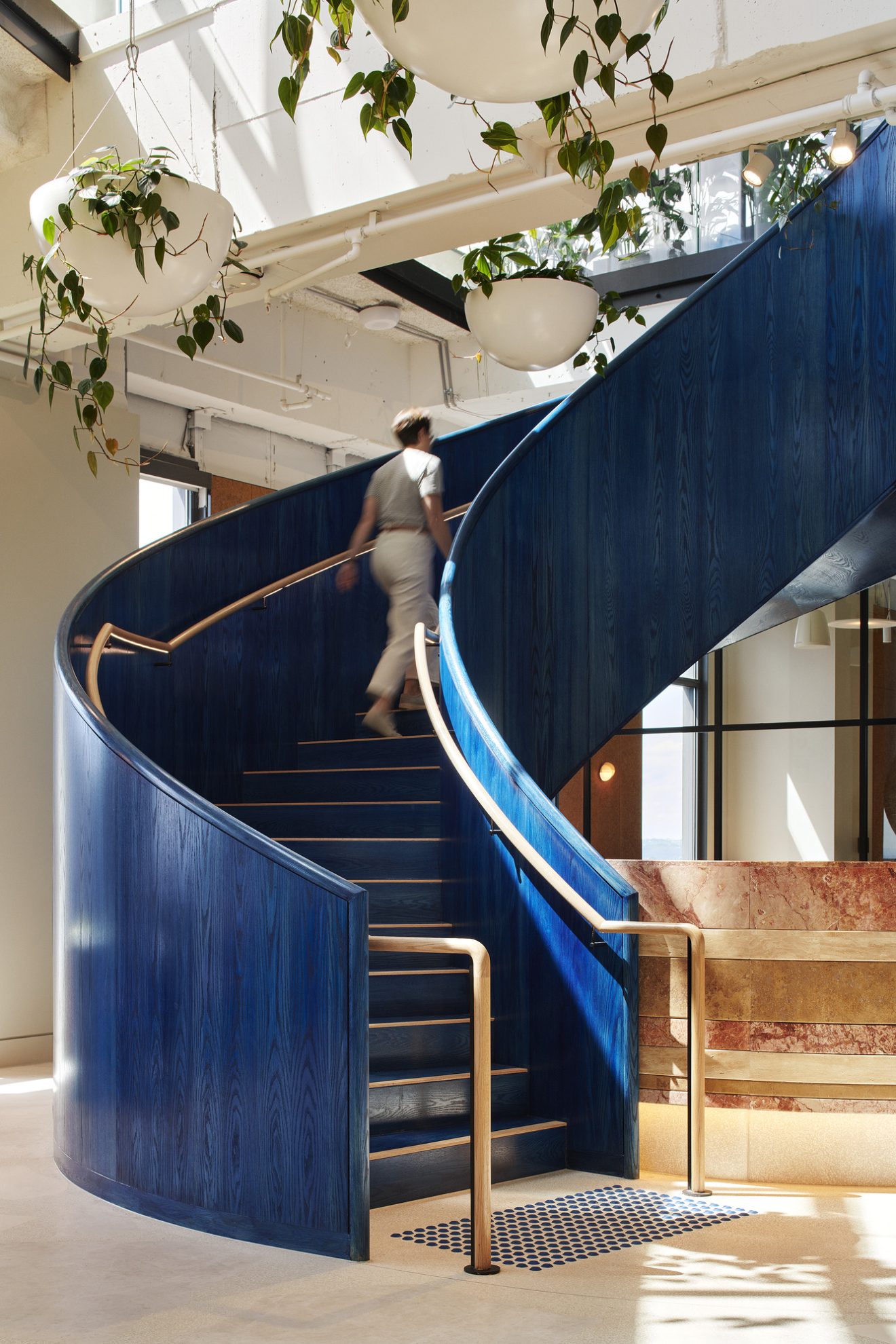 - Sculptural blue oak stairwell as central anchor of identity