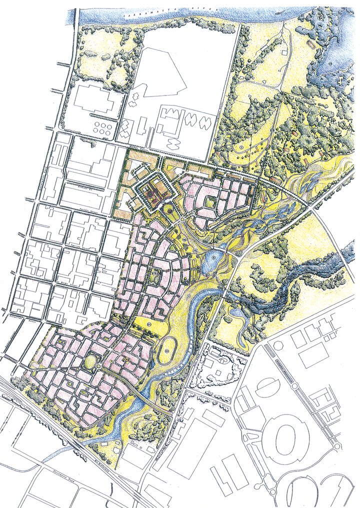 The plan is structured around a public domain framework of neighbourhoods linked by a spine ridge road linking each of the local parks. New streets connect Newington to adjoining laces with the potential to make additional connections to adjoining areas that are currently industrial but may transition to a broader mix of uses through urban renewal.