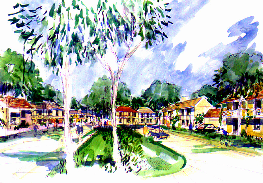 The local centre is placed on axis with the Olympic Boulevard, creating a strong visual link to the larger Homebush precinct. The mix of uses includes the local centre, technology park, and 2,000 apartments and houses. The local centre is connected to the adjoining precinct.
