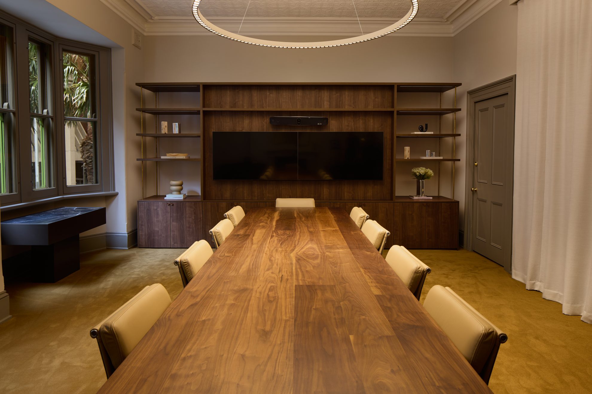 Trust and discretion are pivotal to this organisation’s operations. A series of crafted rooms cater to the diverse needs of the business. A sophisticated cocktail bar and lounge warmly welcome clients into the space, effortlessly pivoting the mood from espressos by day to martinis at night. Meeting rooms with advanced audio-visual technology function seamlessly to connect a global client base and provide a convivial setting for a hatted chef to serve lunch.