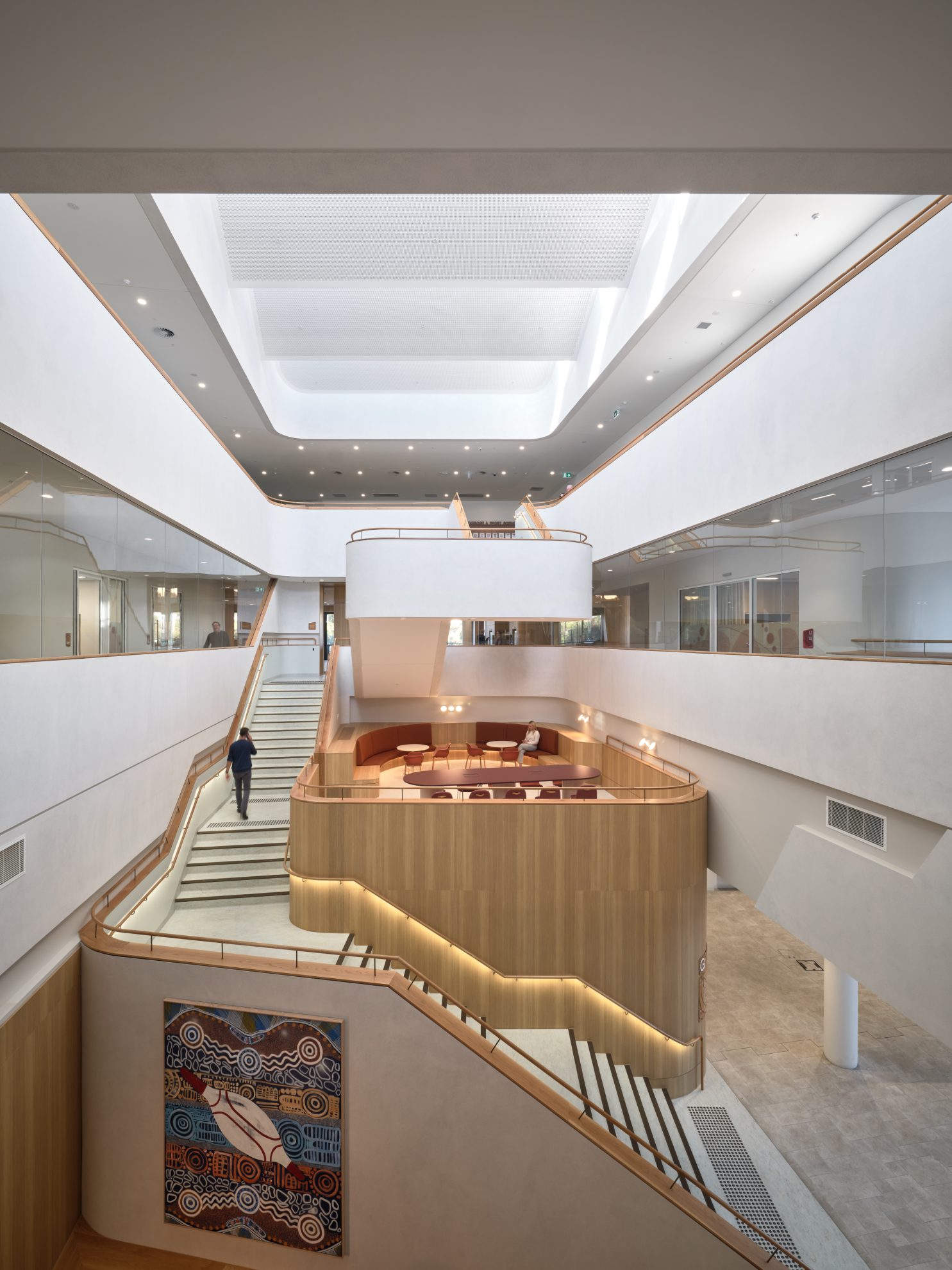 Civic engagement was a driving force behind the design. The building’s forecourts and entry sequences are landscaped for openness and permeability, forming part of a wider public realm strategy that enhances pedestrian and cycle connections across the precinct. These spaces provide moments of rest and gathering. An invitation to participate, observe or simply pass through.
