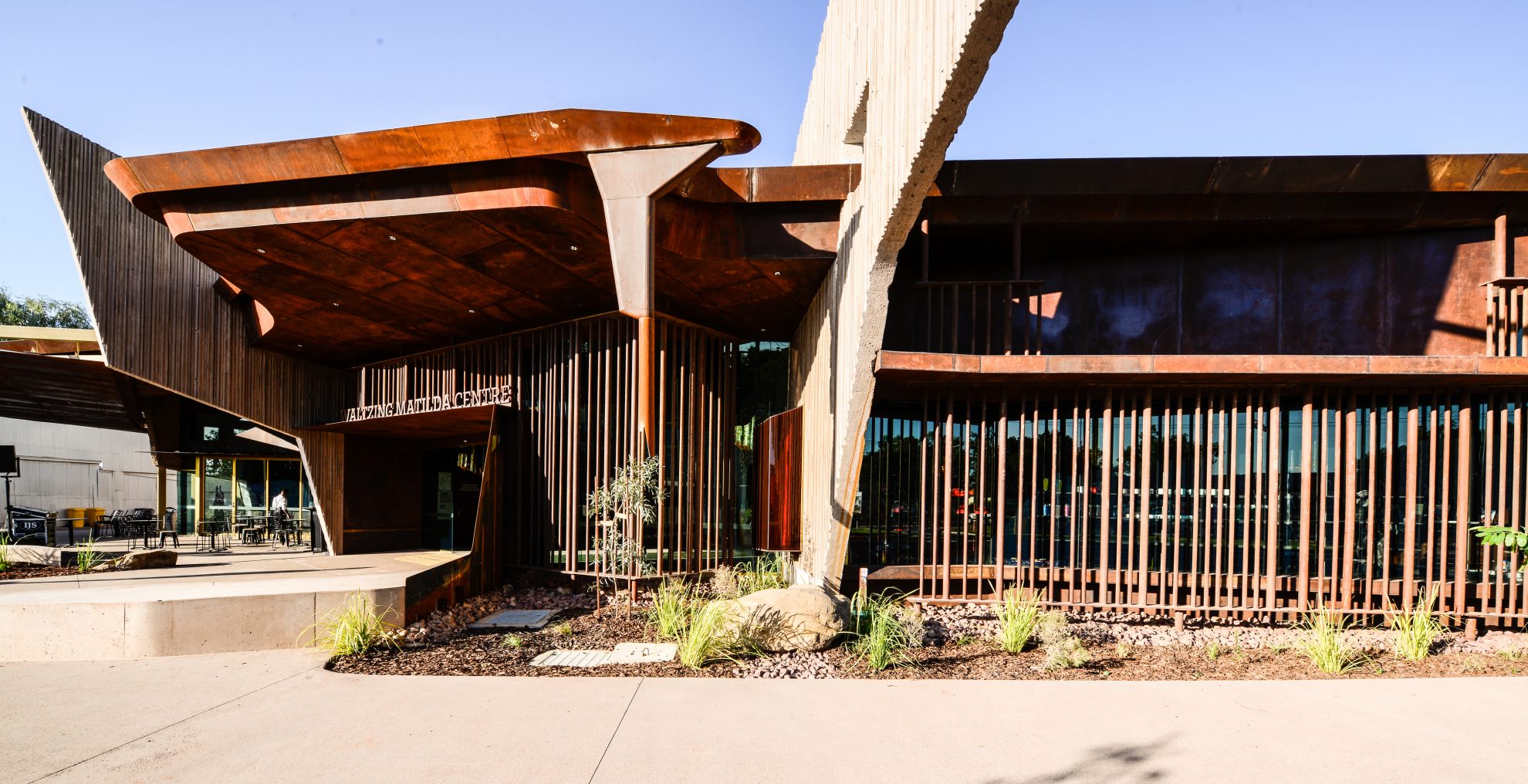 ‘Waltzing Matilda’ conjures many images of our country. The recently completed Waltzing Matilda Centre in Winton, Australia was designed to reflect the significance of this iconic Australian song through an architecture and interpretative experience. The centre is a robust and expressive facility capturing the distinct nature of the landscape and people that inhabit this great land through its’ experiential design. The building’s materials, predominately concrete and rusted steel, have been crafted, textured and shaped to capture the distinct landscapes found in the Winton Shire: the ‘jump-up’ rock formations, water movement and of course, the billabongs. The stark and rugged beauty of this broken landscape comes to life with joy and hope when the rains come, and the design of this facility seeks to express the honesty, resourcefulness and resilience exemplified by the people who live in this remote region.