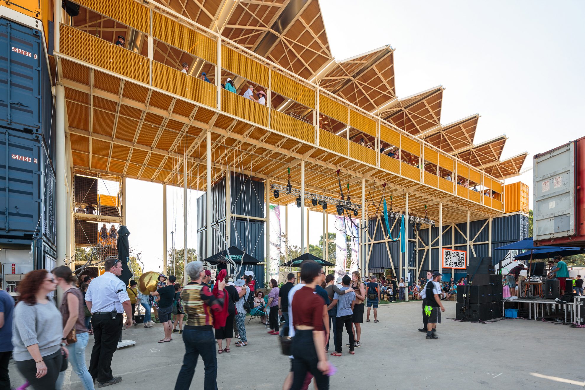 The site’s past as an outdoor Futsal field, with a flat engineered concrete slab, provided an ideal base for the built structures. Ronan Moss described the structure as ‘Meccano-like,’ consisting of primarily shipping containers and metal piping. The project, albeit a ‘pop-up,’ was no small feat – covering 500 square metres with all elements able to be reused into building works around Canberra.